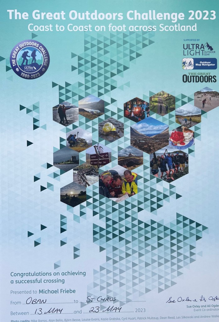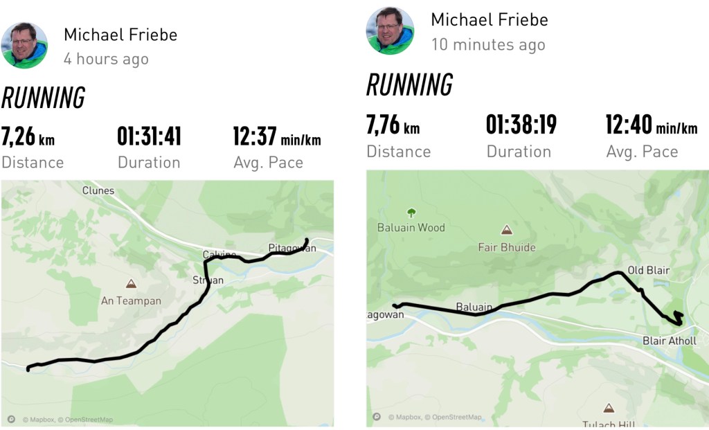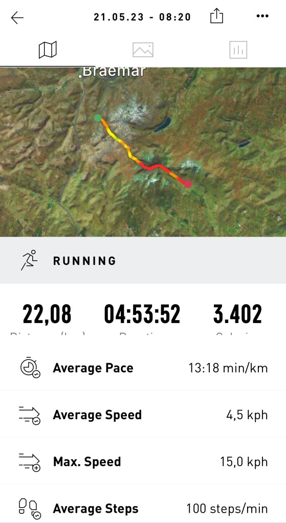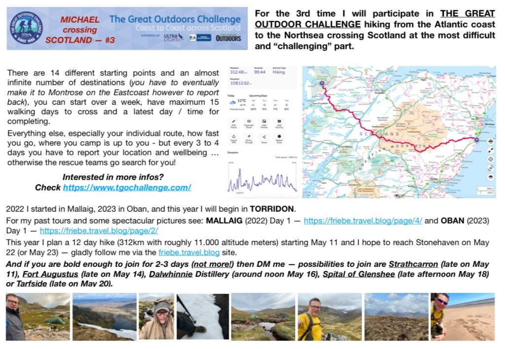 If you plan to meet me and walk with me (😎🥳) I will be leaving Torridon (Youth Hostel) May 11 at around 10:00 and plan to be in Strathcarron (train station) around 14:00. Additional meeting spots could be Fort Augustus on May 14 (not before 16:00), the Dalwhinnie Distillery around noon on May 16, Spital of Glenshee late afternoon on May 18, Clova Hotel late on May 19, and finally Tarfside late on May 20.