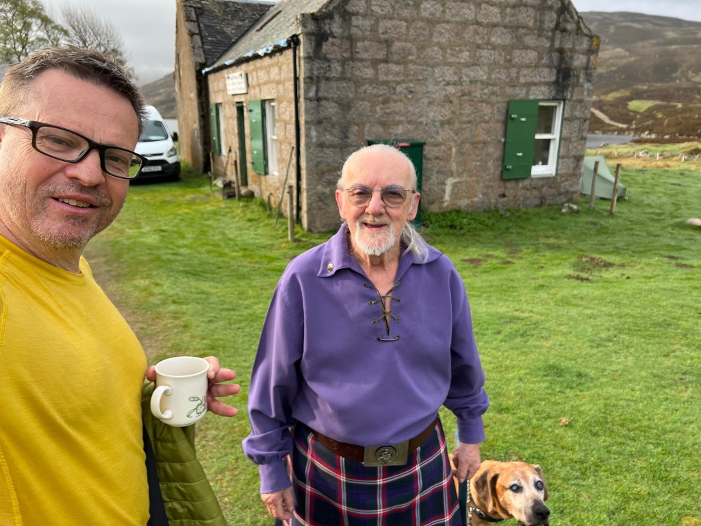 After descending into Glen Esk I followed the road towards Tarfside and about 1km before my final stop I was greeted by 92 year old Angus, a retired sheep farmer, and his 3 legged dog. He forced me very friendly to have a cup of tea with him and to chat about live and other things 😀 … and he made me sign his guest book … incredibly full and very international, which makes me assume that this is his prime activity these days. Very friendly and entertaining … Angus later showed up at the BBQ on his mountain bike 🚵 and stayed pretty much till the end!!
