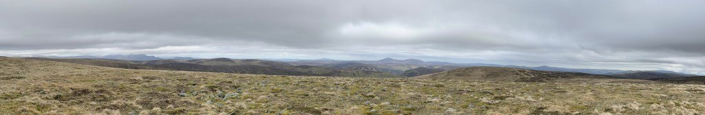 Panoramic view — from left to right — LOCHNAGAR range … Cairngorms (with the snow) … Mount Keen